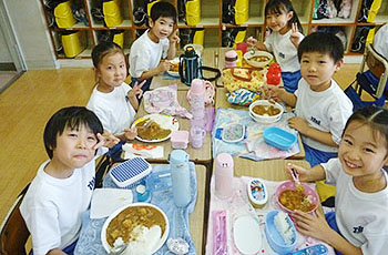 6年生が農園で育てたジャガイモを使って、カレーを作っていただきます。子どもたちはこの行事を楽しみにしていて、みんなたくさんおかわりをしています。