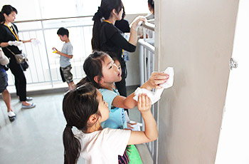 有志で集まった児童と保護者の皆様の手によって、校内の汚れた壁を磨いていただくという活動です。きれいになった校舎で、子どもたちは気持ちよく過ごすことができます。