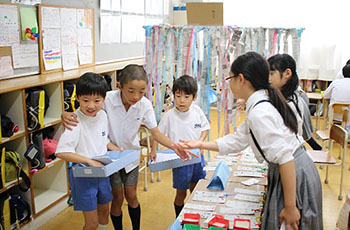 委員会バザーでは、それぞれの委員会の特徴を伝えられるような商品やアトラクションを考え、販売します。新聞委員会の新聞づくり体験、図書委員会の手作りしおり、魚委員会の魚つりゲームなど、子どもたちの発想力には驚かされます。毎年、低学年の子たちは、購入した商品を片手にとても嬉しそうにしています。学校全体が笑顔に包まれる楽しい時間です。