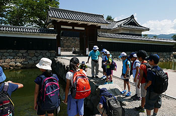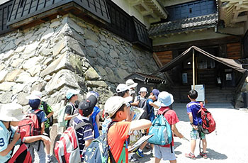 4年生は、2日目に松本城を見学します。五層の天守閣としては日本最古のお城です。そのスケールの大きさに子どもたちは驚きの声を上げます。実際にお城の中に入り、現地の方にいろいろなことを教えていただきます。