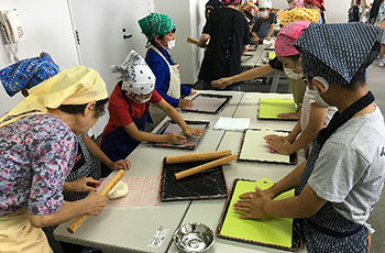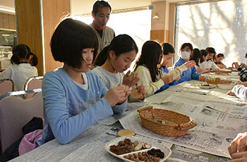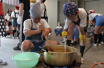 3年生は「やしょうま」作りを体験します。「やしょうま」は信州郷土料理の一つで、米粉を主な原料とした食べ物です。地元の方に作り方を教わりながら一生懸命作り上げ、夕食時には作ったものを4年生にふるまいます。手作りの郷土料理を、子どもたちは大事そうにいただきます。