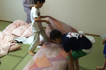 宿舎での生活では、部屋で布団を敷いたり各自の荷物を整頓したりと、自分でしなければならないことが多くあります。互いに声をかけ合い、協力しながら生活を共にする3日間、子どもたちは多くのことを学びます。サマーキャンプでの経験が、その後の学校生活にも生かされます。