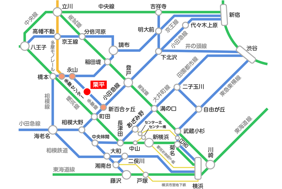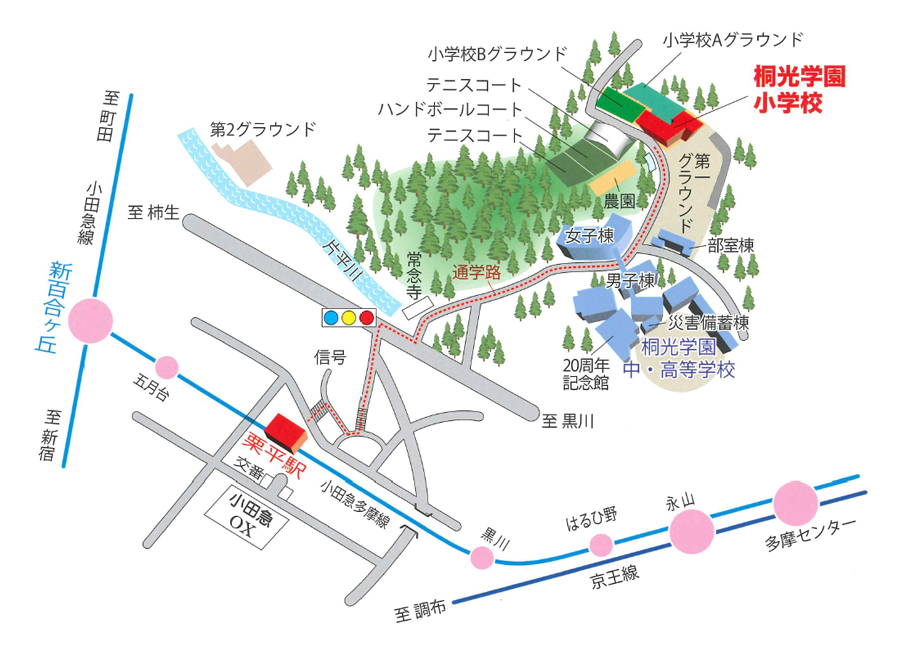 最寄り駅(栗平駅)からの詳しい道案内は、桐光学園小学校までの経路地図をご覧ください。