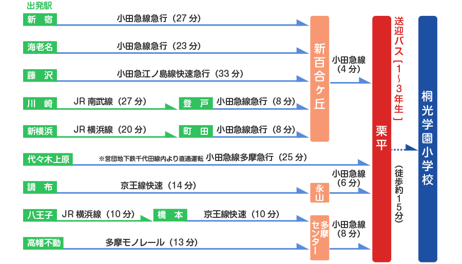 ※栗平駅から桐光学園小学校まで徒歩約15分です。(1~3年生は、栗平駅からスクールバスで登校します。)