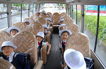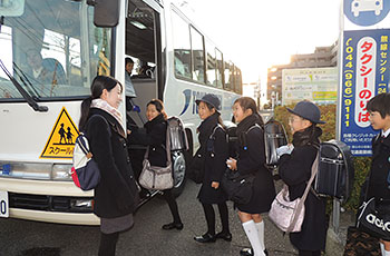 1~3年生は、登下校の安全を考慮し、栗平駅から学校までをスクールバスで送迎します。朝のバスは、7:30発の1便から8:06発の6便まであります。1年生の多くは、5、6便のバスに乗って登校しています。