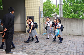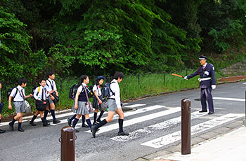 児童の安全確保のため、通学路において横断歩道・校舎前での教員による安全指導、及び警備員の立哨などの対策を講じております。