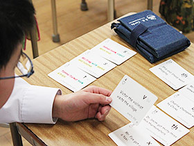 中学年にあがると「英語の蓄積」をテーマに、64種類約400語を扱う英語カルタを使って繰り返し英語に触れます。自然と日常会話でよく使う言い回しや英文法の知識が感覚的に身についていきます。