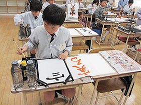 毛筆の授業は、書道専門の教員が担当し、基本的な筆の持ち方や運び方などを一から教えています。毛筆書字は、その特徴によってゆっくり書くことになります。さらに、何度も繰り返し書くことで文字を理解していきます。これは、点画の種類やつながりを理解するには必要な練習です。また、毛筆の持ち方や使い方などの技術だけでなく、姿勢や態度も大切にしています。その上で、子どもたちにとって達成感のある授業を目標に行っています。