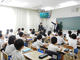 4年生の総合の時間を使って、「知的財産」の授業を行っています。外部講師として弁理士の先生をお招きしての特別授業です。知的財産とは、「人が考えたよいモノ・コト」で、身近な「知的財産」について考えています。初回の授業は、今の包丁ができるまでを、子どもたちの意見を聞きながら考えました。道具がなかった時代、人はどうやって食べ物を切り分けたのかということから、石を加工していったことに気づきました。そして石包丁が現在の包丁の原型であることにたどり着きます。包丁一つをとっても、多くの知的財産が集まってできています。授業を通して、普段何気なく使っている物が、実はいろいろな工夫がされて今の形になったことに気づくことができます。